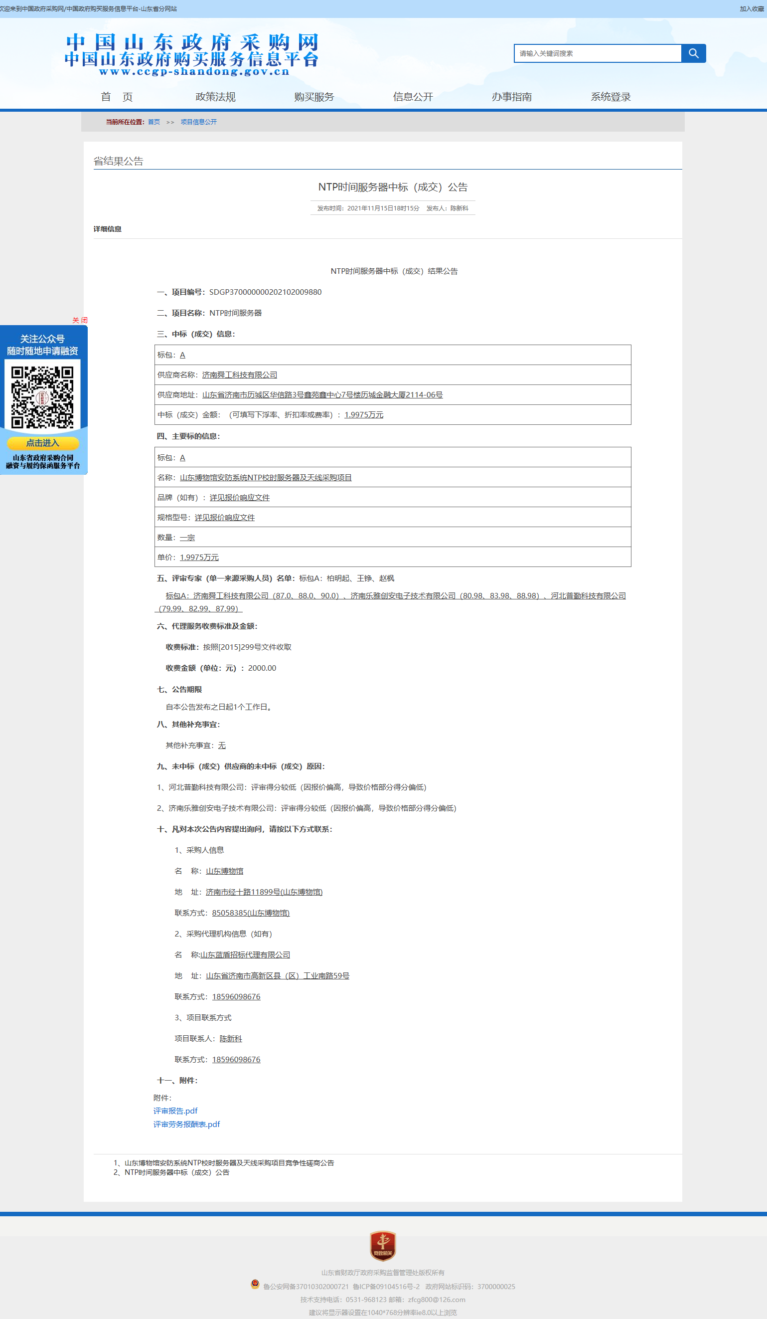 山東博物館安防系統(tǒng)NTP校時(shí)服務(wù)器及天線采購項(xiàng)目成交公示