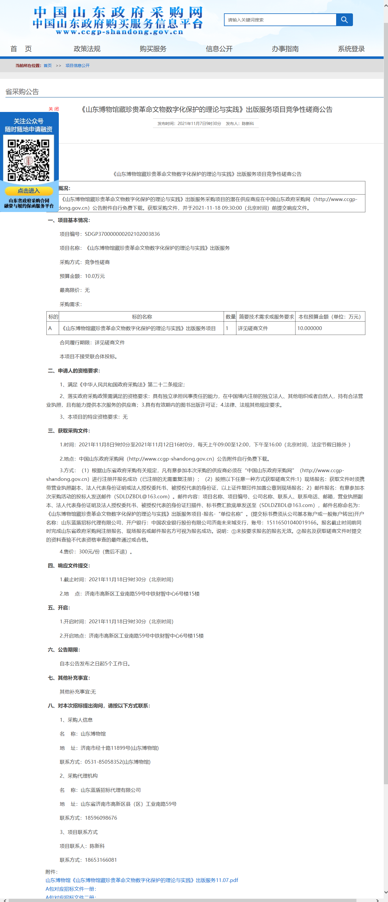 《山東博物館藏珍貴革命文物數(shù)字化保護(hù)的理論與實(shí)踐》出版服務(wù)項(xiàng)目 競(jìng)爭(zhēng)性磋商公告