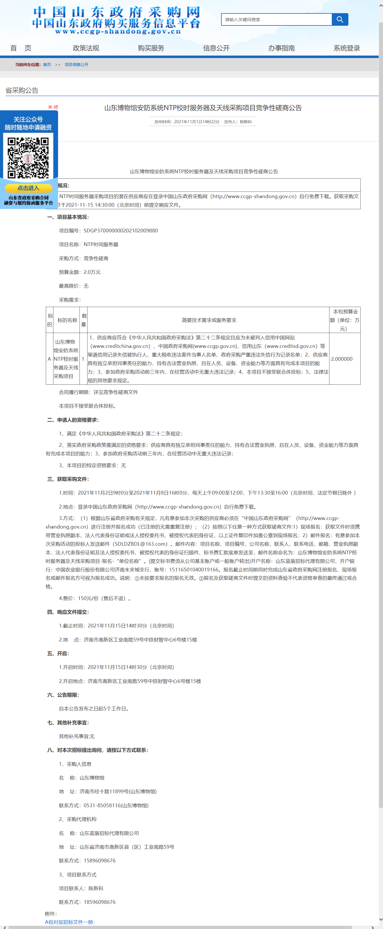 山東博物館安防系統(tǒng)NTP校時服務(wù)器及天線采購項目競爭性磋商公告