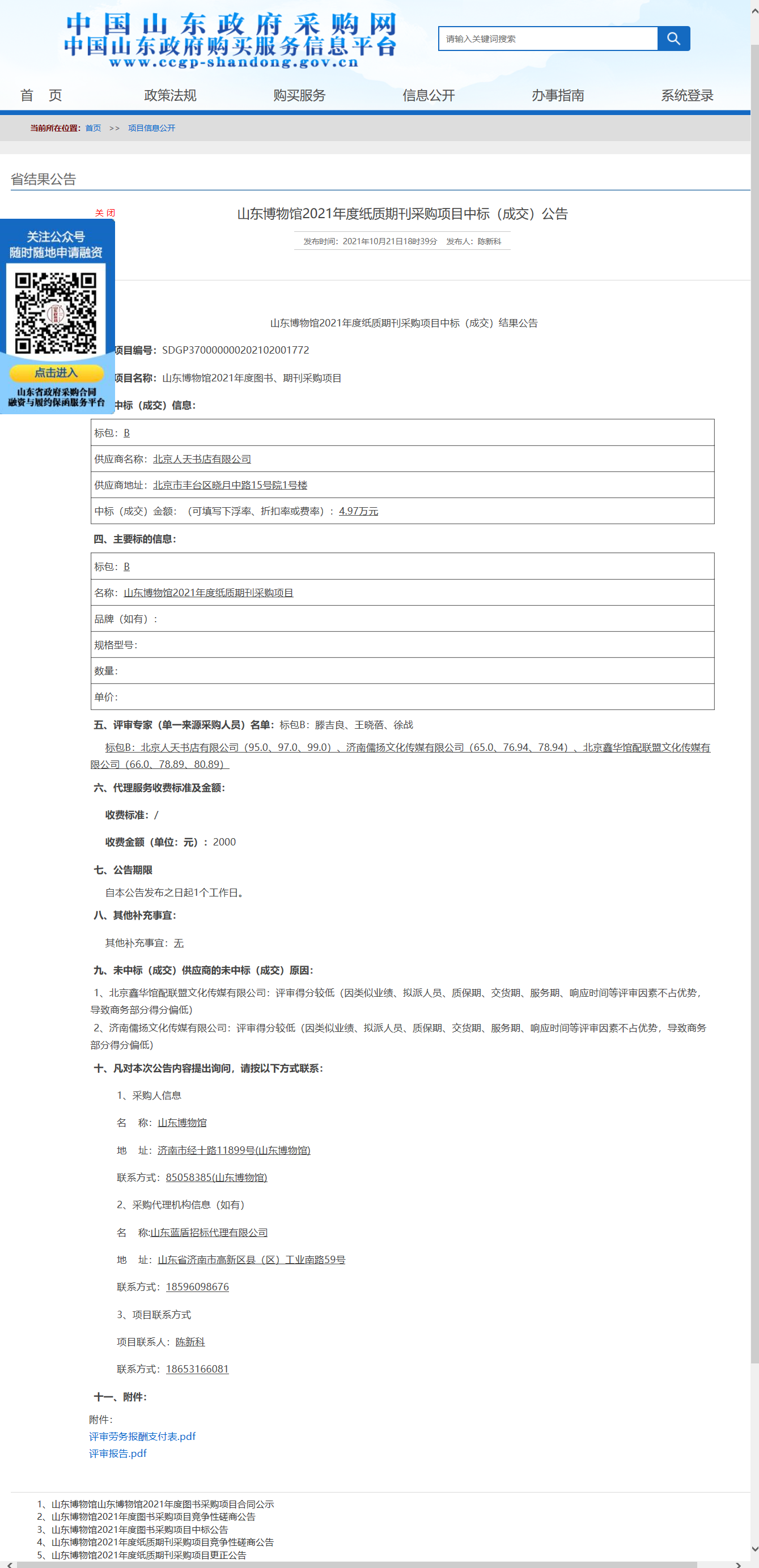 山東博物館2021年度紙質(zhì)期刊采購項目成交公告
