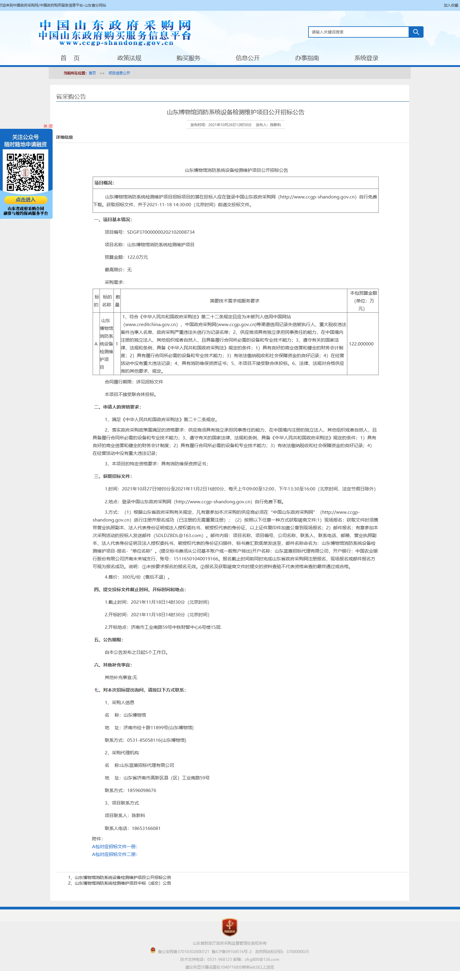 山東博物館消防系統(tǒng)設(shè)備檢測維護項目公開招標公告