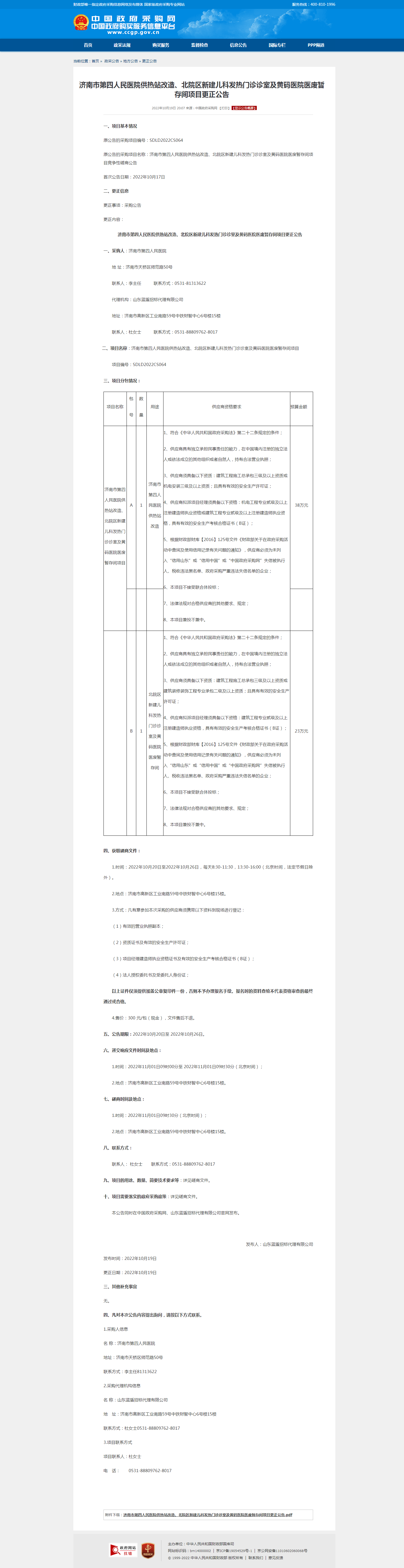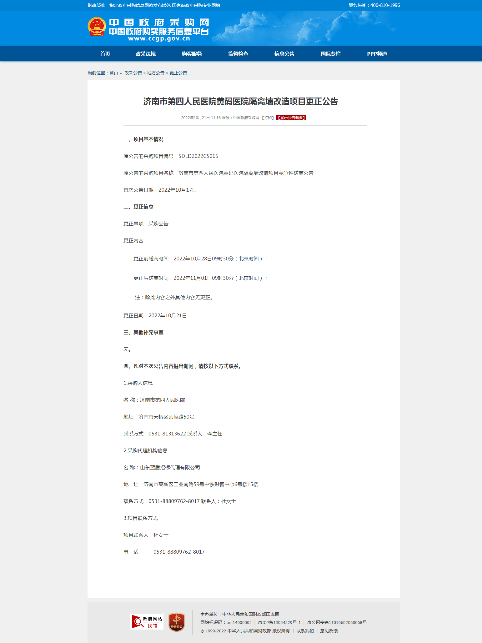 濟(jì)南市第四人民醫(yī)院供熱站改造、北院區(qū)新建兒科發(fā)熱門診診室及黃碼醫(yī)院醫(yī)廢暫存間項(xiàng)目更正公告