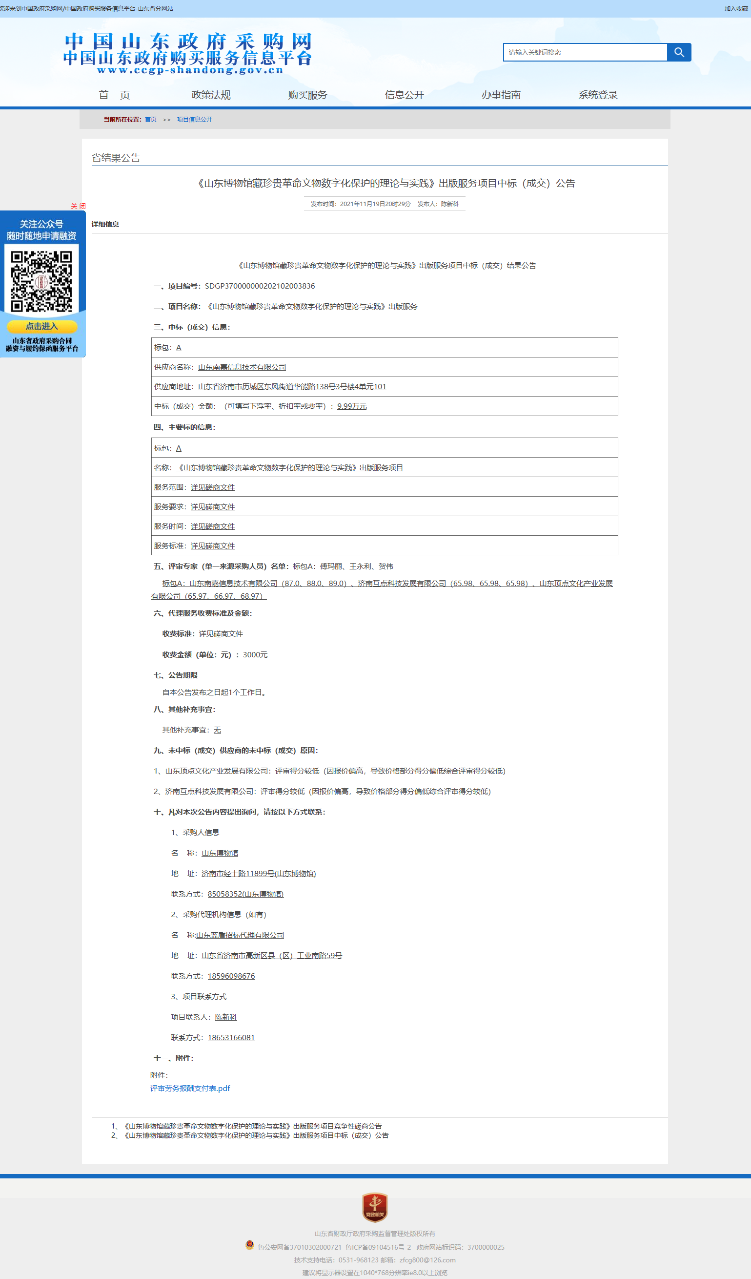 《山東博物館藏珍貴革命文物數(shù)字化保護(hù)的理論與實(shí)踐》出版服務(wù)項(xiàng)目成交公示